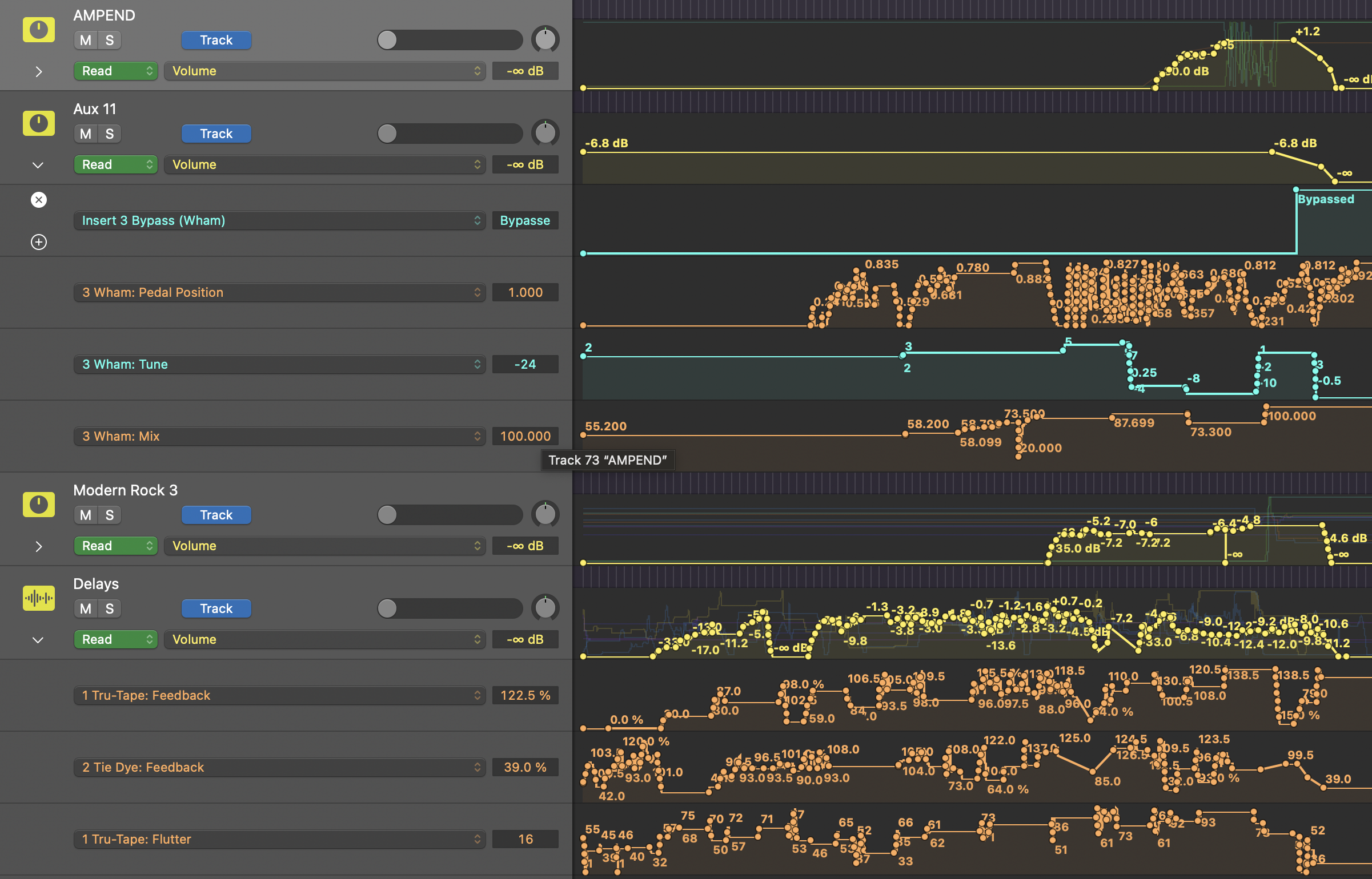 You can see the automations for the delay pedals and the amps. Automations are adjustments made in a Digital Audio Workspace that stay printed into the track.